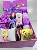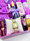 باکس هدیه بنفش سورپرایزی ساعت نگین دار محصولات لوکس و زیبا پرفروش ادکلن ساعت نگین دار هدیه روززن روزمادد