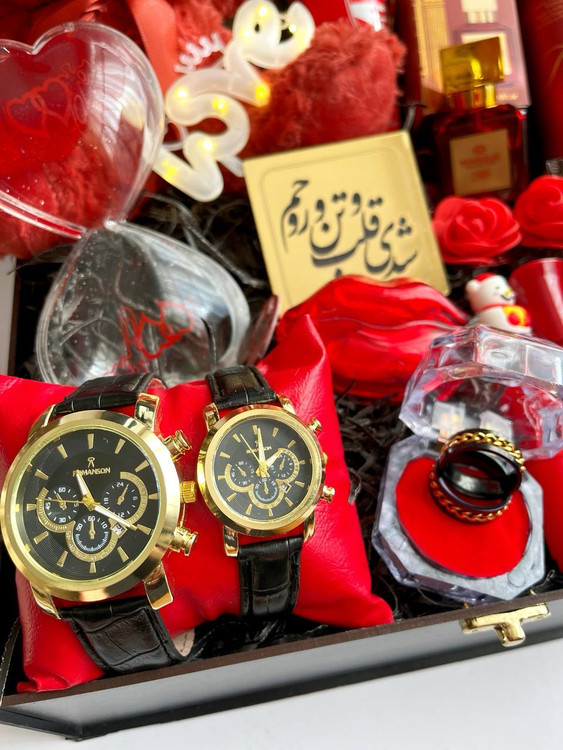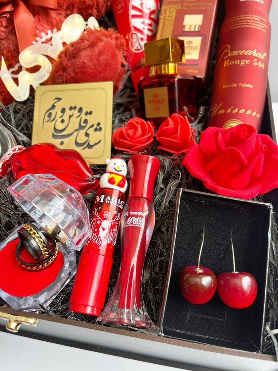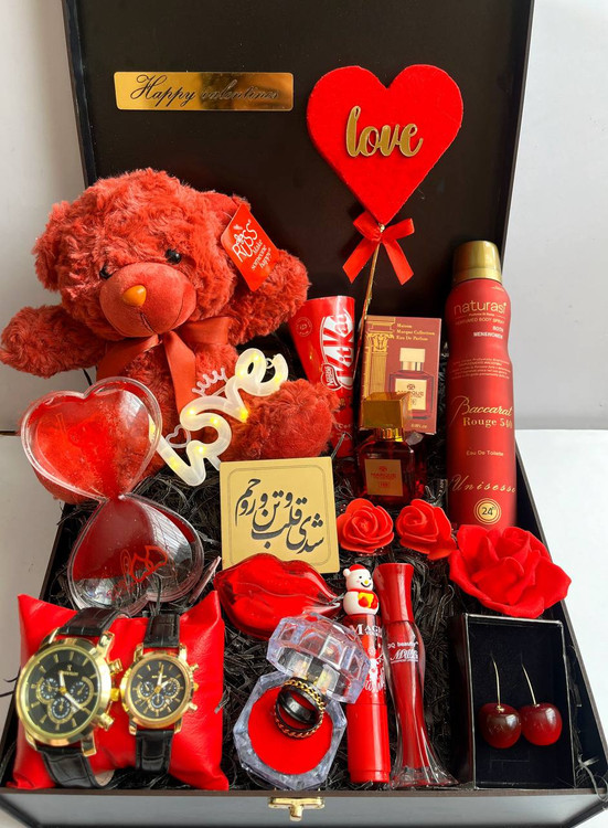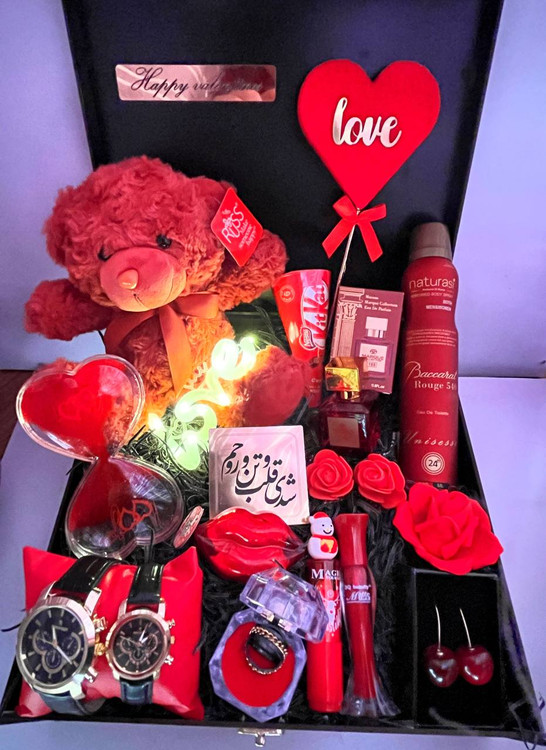 باکس دخترانه ولنتاین با کیفیت لوکس و vip خوشگل زنانه گوگولی شلوغ و کامل هدیه زنانه خاص پر فروش ست ساعت خرس لوازم آرایش لاو چراغدار باکس چوبی