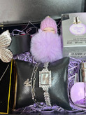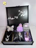باکس شیک زنانه بنفش تولد پروانه جواهری کمربند ساعت نگین دار ظریف زنانه ادکلن بی نظیر اکلت روز زن خانومم