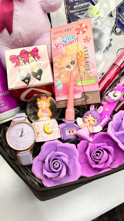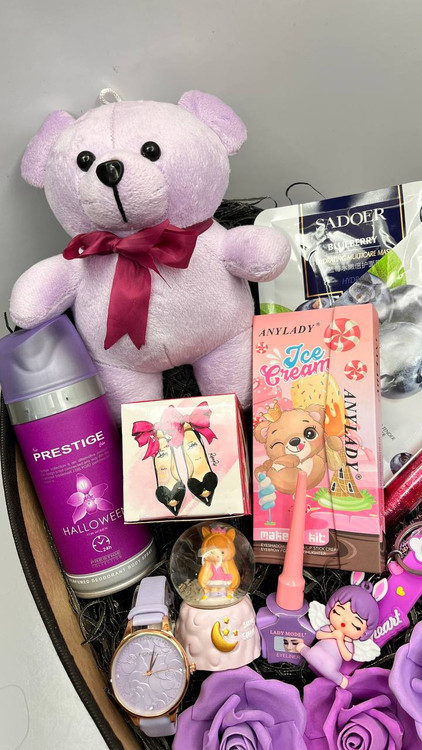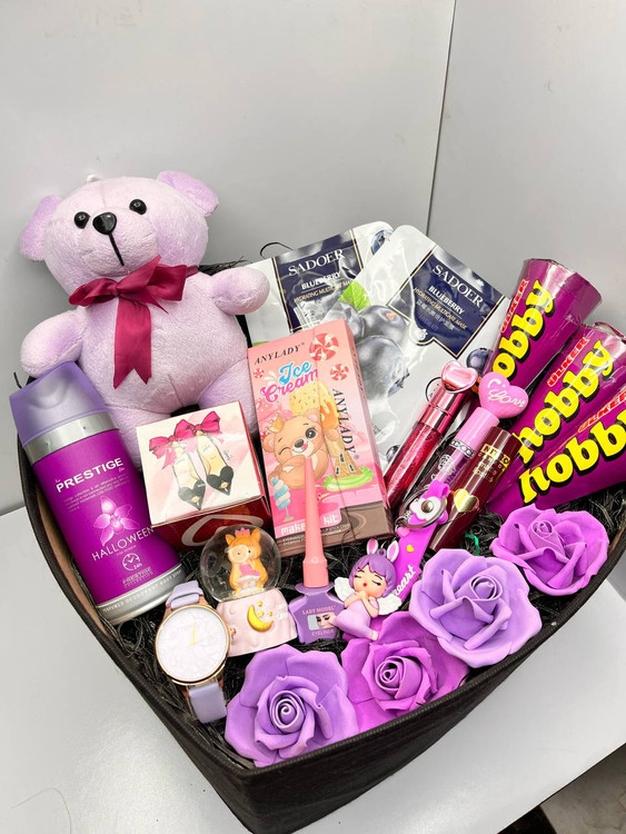 باکس خوشگل قلب بزرگ هدیه تولد عیدی خاص زنانه رنگ بنفش شکات خرس ساعت ارایشی ارسال رایگان روز دختر