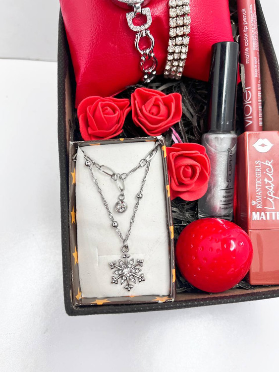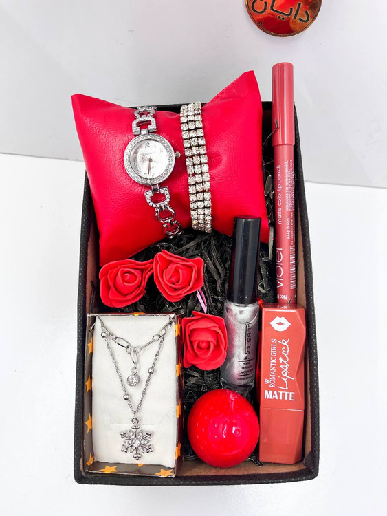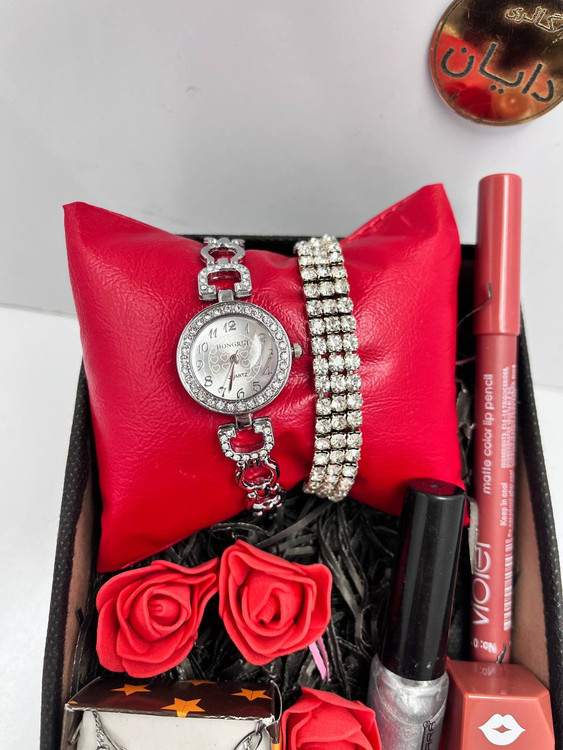باکس‌ هدیه اقتصادی زنانه‌ ساعت ظریف نگین دار نقره‌ای بالم لب رژ لب قرمز ولنتاین روز عشق دخترانه ولنتاینی