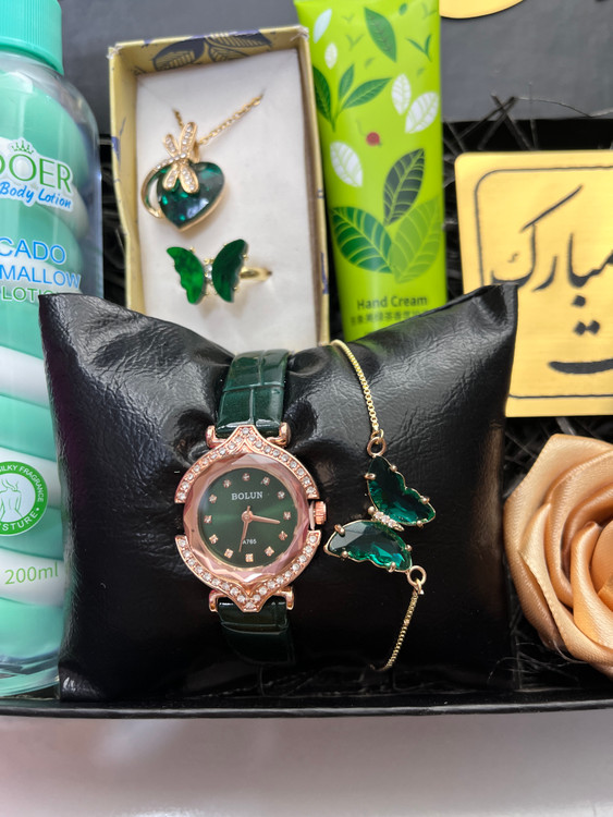 سالگرد ازدواج . پک هدیه سبز زنانه یا دخترانه. ساعت بندی چرمی سبز نگین دار جذاب