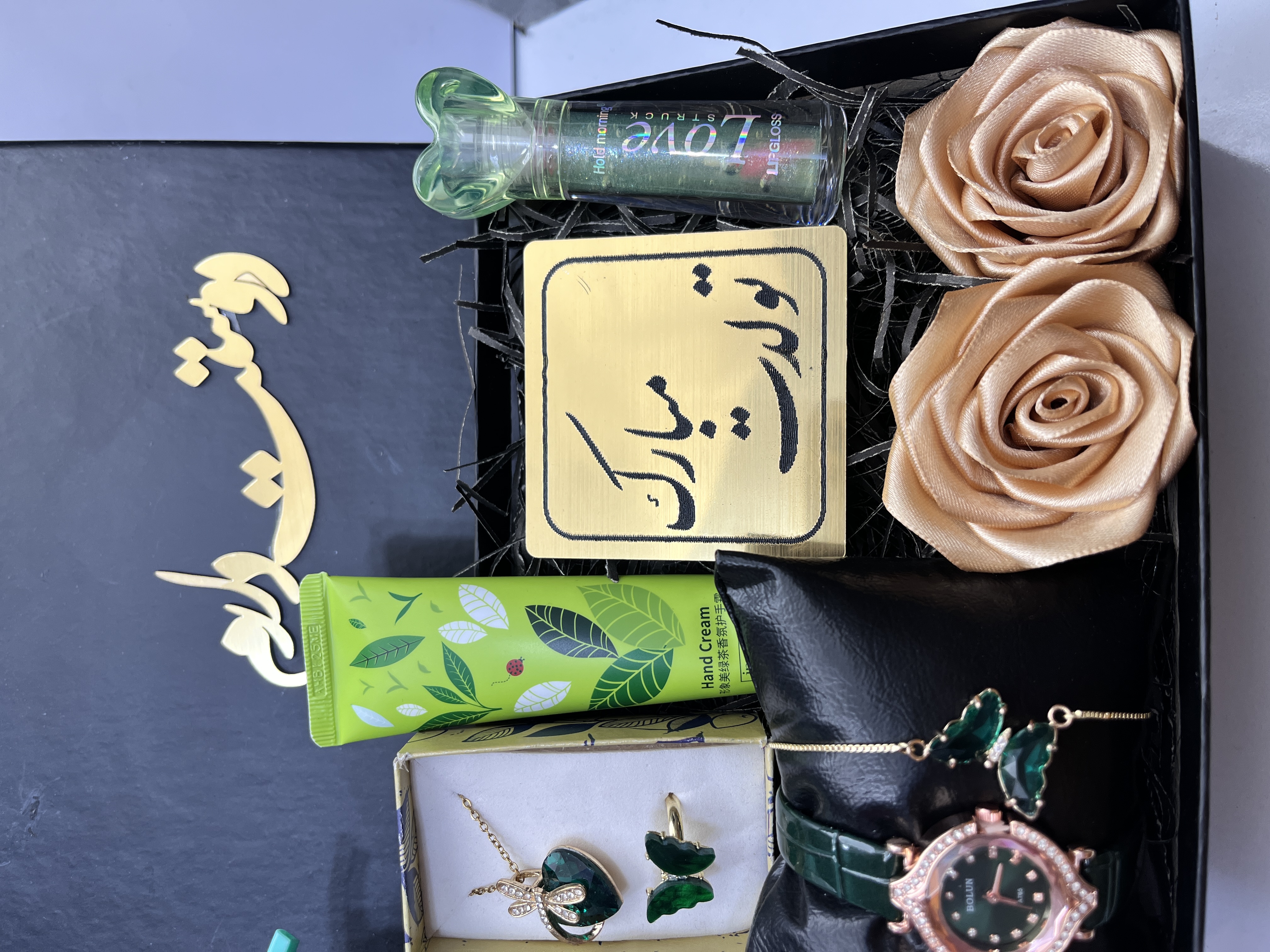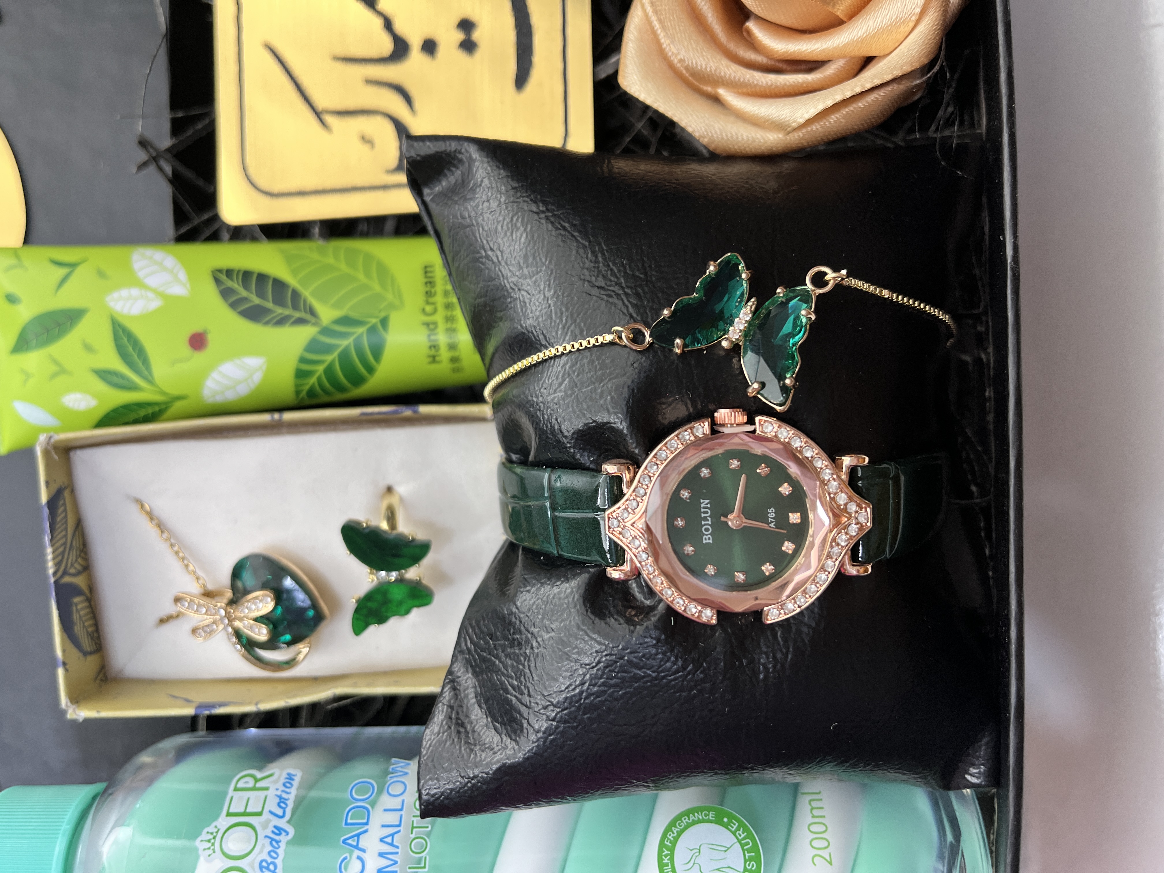 سالگرد ازدواج . پک هدیه سبز زنانه یا دخترانه. ساعت بندی چرمی سبز نگین دار جذاب