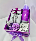 باکس هدیه زیبا مخصوص تولد زنانه کادوی هدیه بنفش تولدت مبارک ارسال رایگان ساعت مجلسی ظریف نگین دار اسپری و ادکلن