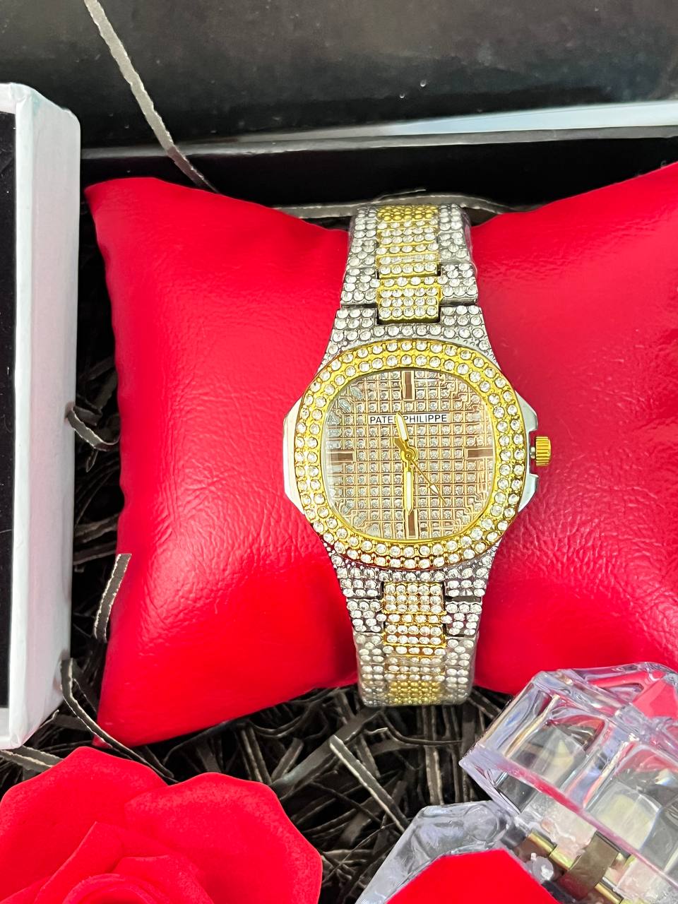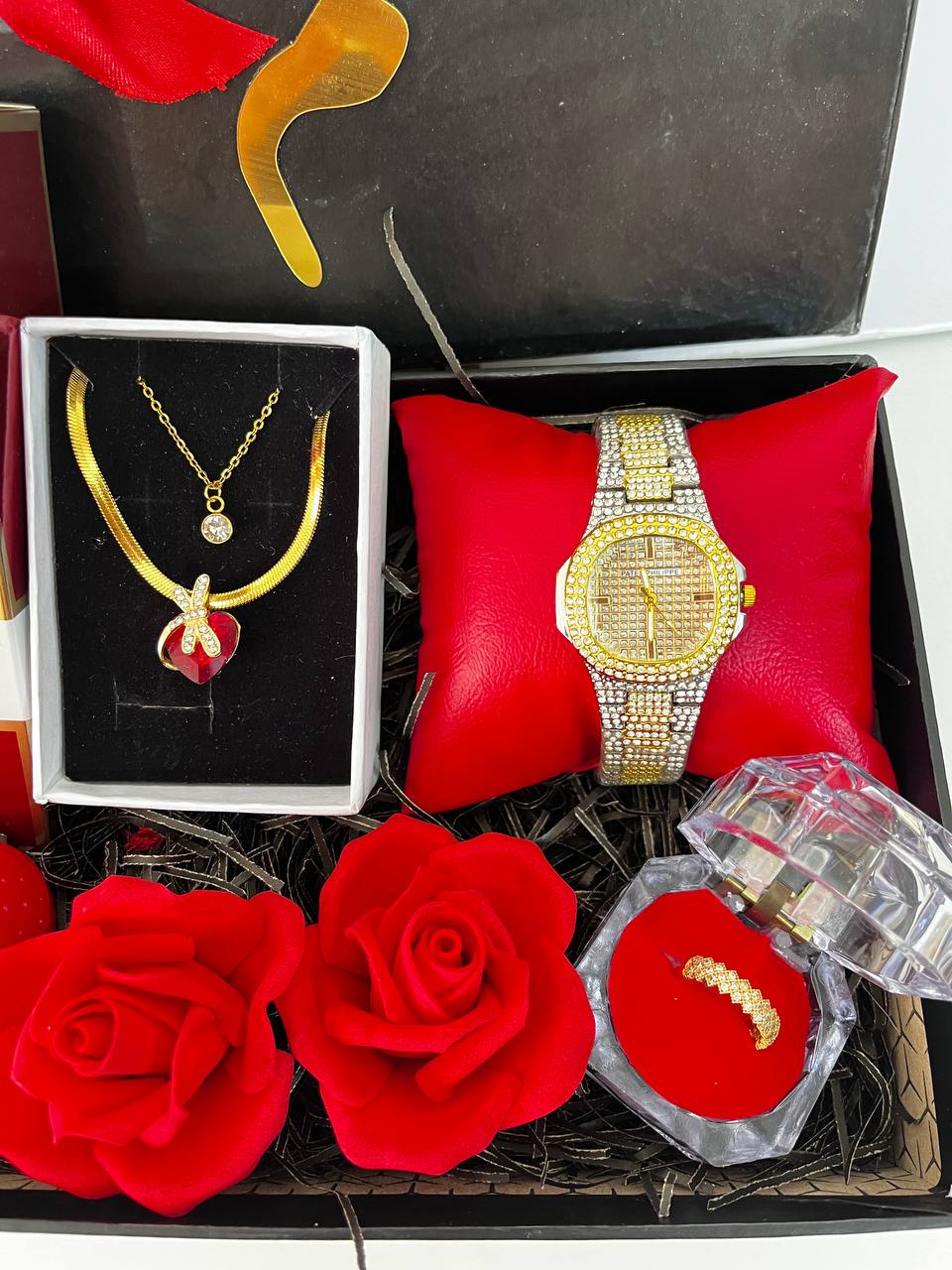 باکس هدیه خاص و جذاب زنانه ساعت فول نگین جذاب ادکلن گودگرل قرمز ارسال رایگان هدیه جذاب نامزد باکس روز دختر