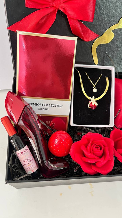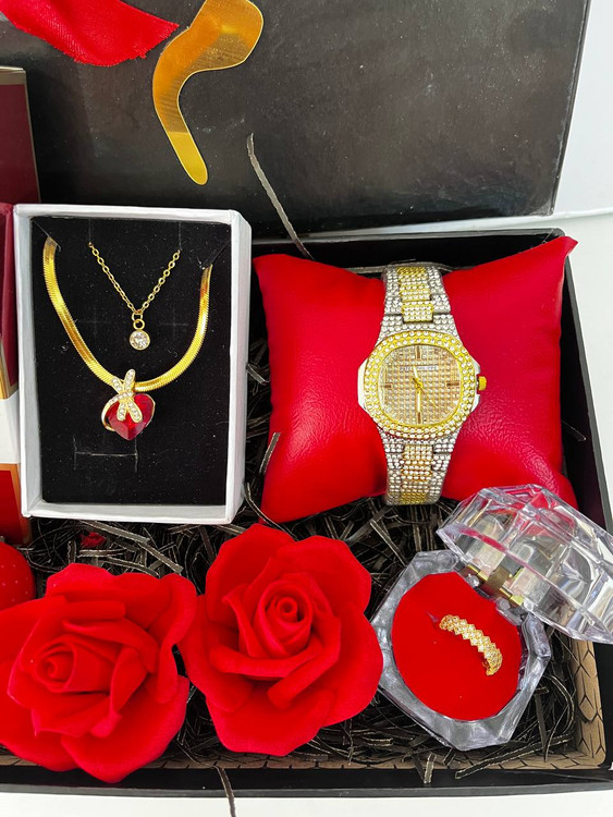 باکس هدیه خاص و جذاب زنانه ساعت فول نگین جذاب ادکلن گودگرل قرمز هدیه جذاب نامزد باکس ولنتاینی هدیه تولد