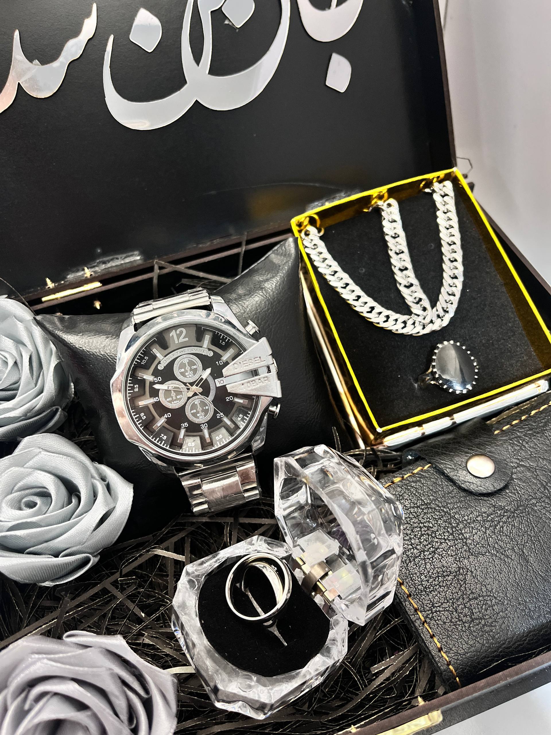 باکس هدیه خاص مردانه کادوی شیک آقایان ساعت دیزل شاخدار طرح اصلی ست گردنبند استیل ارسال رایگان
