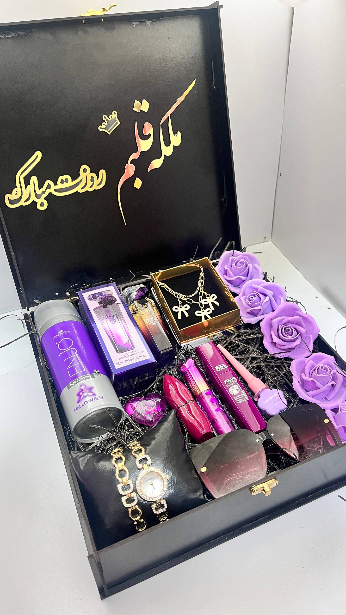 پرفروش وخاص ترین باکس هدیه زنانه کادویی ملکه ی قلبم روزت مبارک هدیه روززن روزمادر سورپرایزی شیک بنفش عینک دودی ارسال رایگان