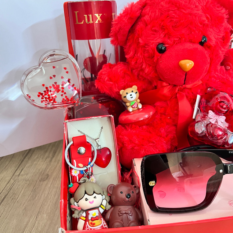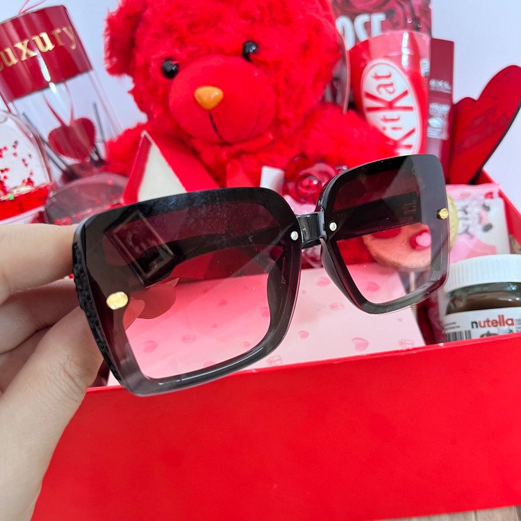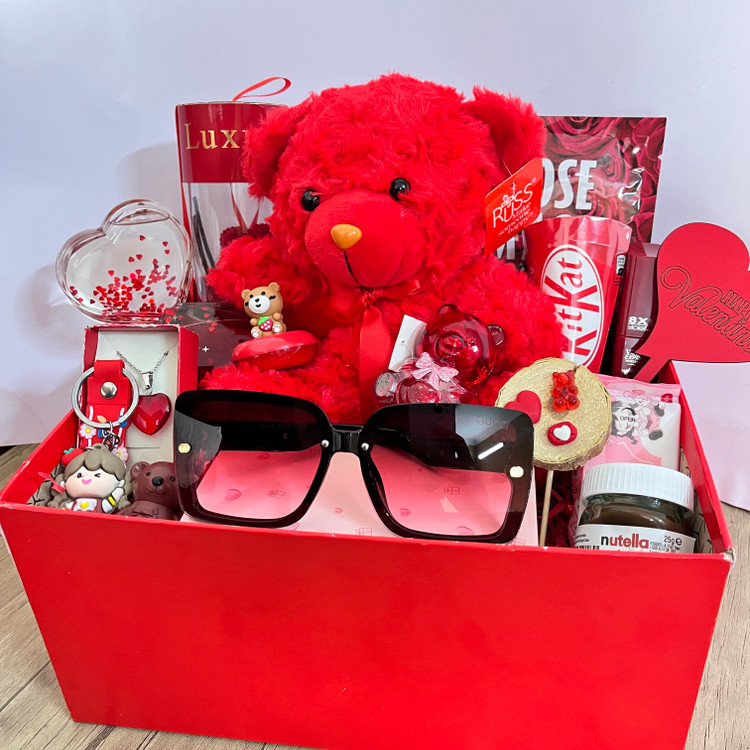 باکس هدیه ولنتاین بزرگ و شلوغ دخترانه کادوی خاص و جذاب خرس خارجی شیک عینک دودی یووی شیشه عشق