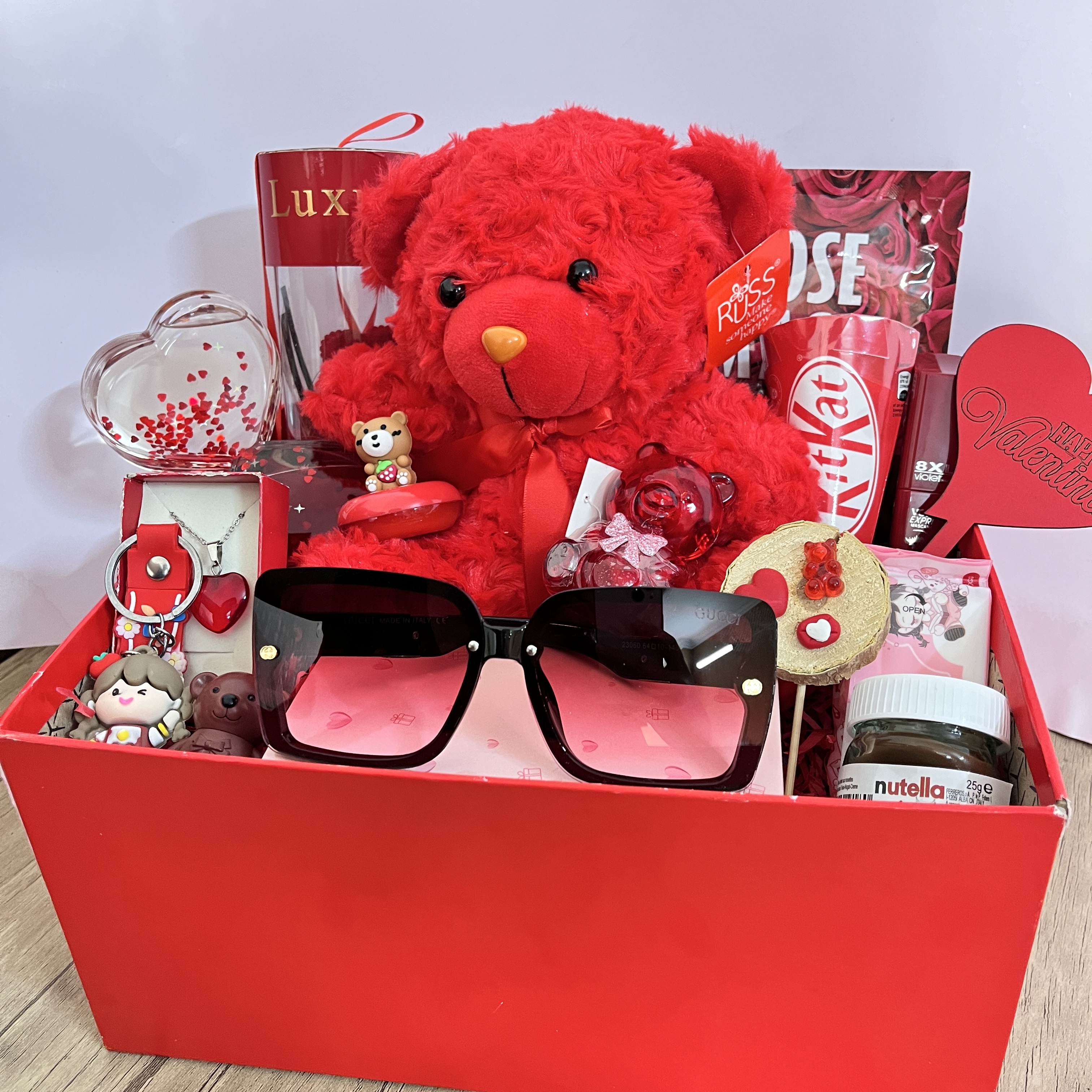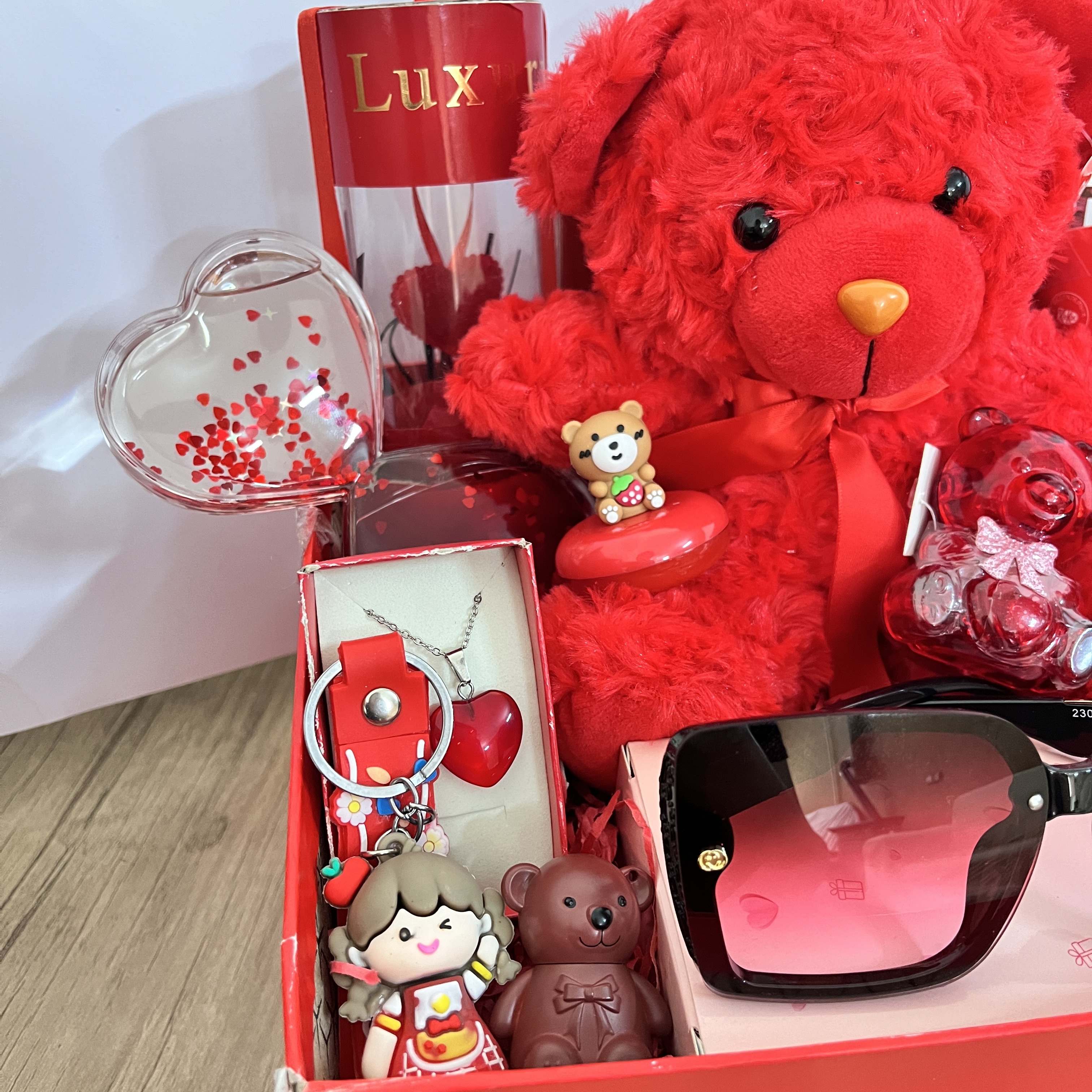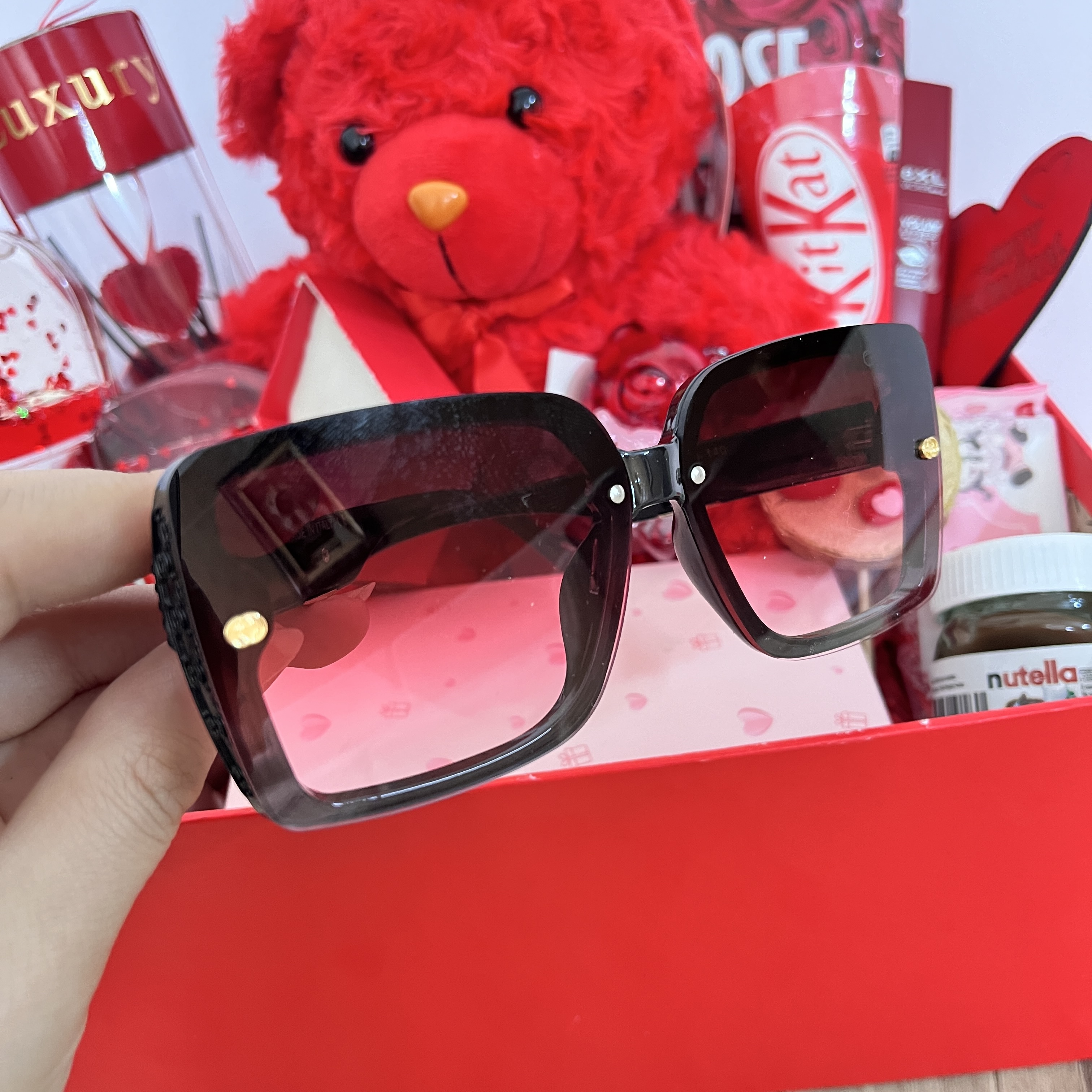 باکس هدیه ولنتاین بزرگ و شلوغ دخترانه کادوی خاص و جذاب خرس خارجی شیک عینک دودی یووی شیشه عشق